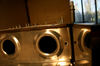 Ensuite, cette nervure est percée entre les cannelures et au centre des rebords afin de réaliser la jonction entre la partie supérieure et inférieure du revêtement.